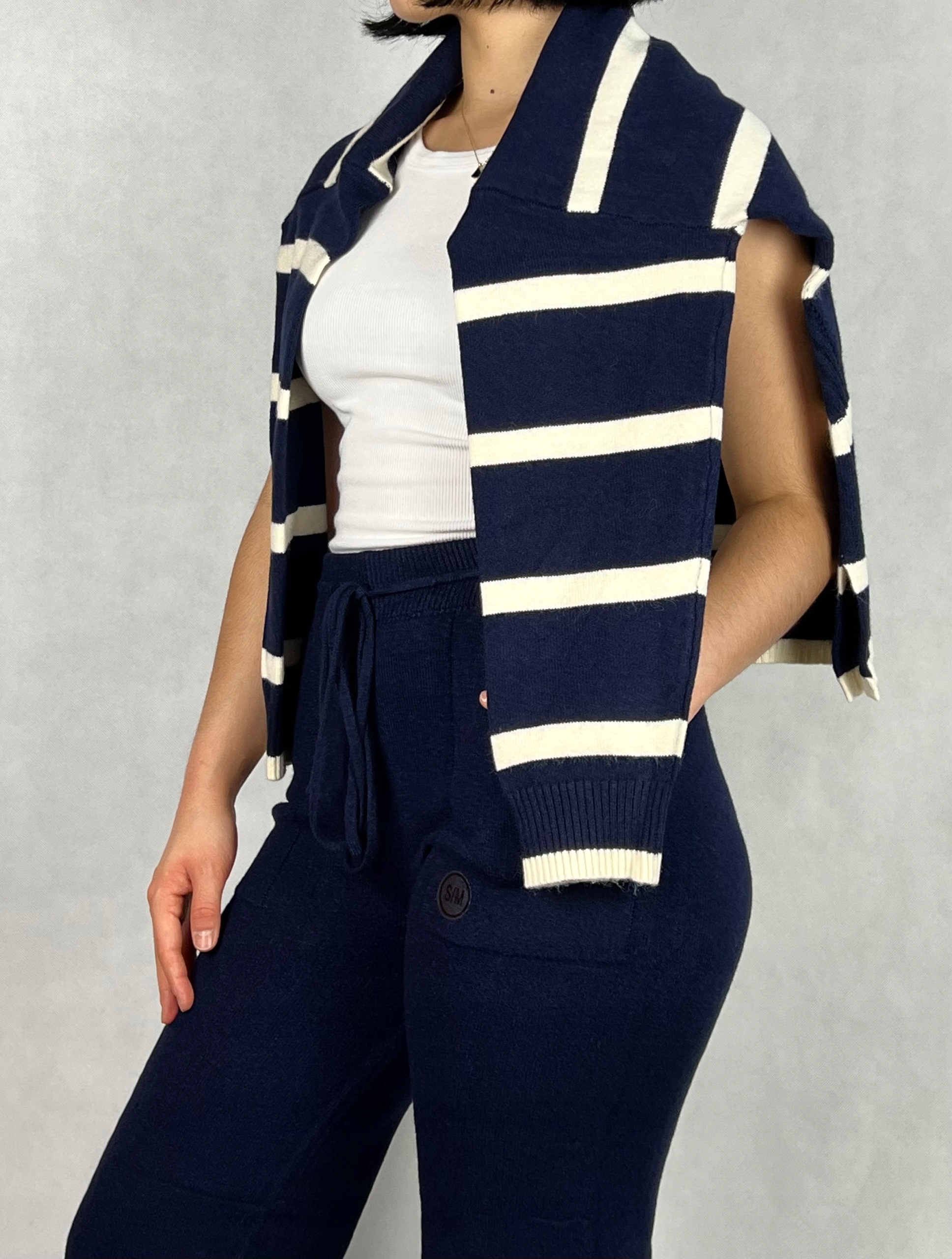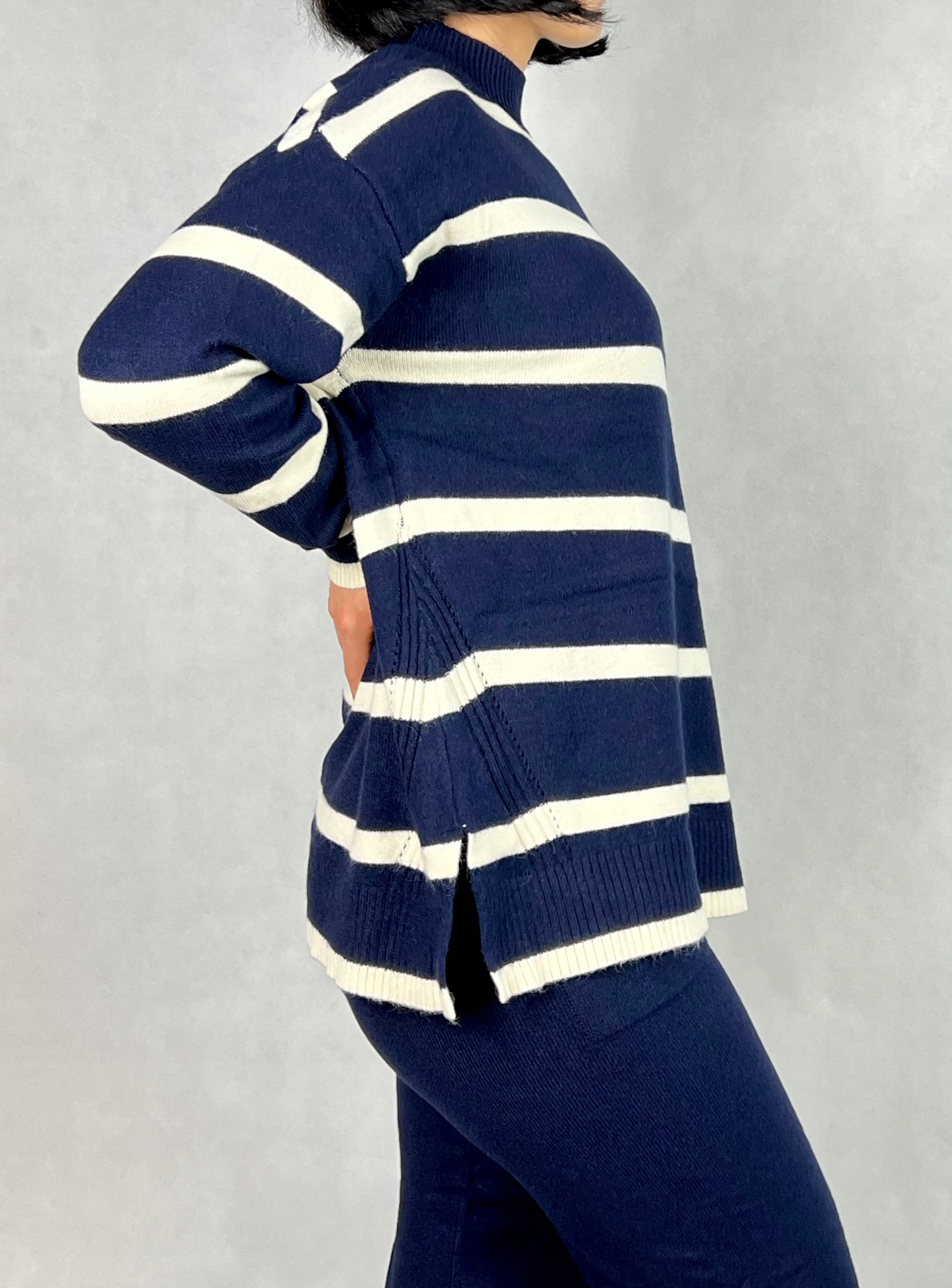 Damski komplet dwuczęściowy, sweter ze spodniami, to idealny wybór na co dzień, łączący styl i wygodę. Dwuczęściowy zestaw składa się z miękkiego swetra w paski z golfem, który zapewnia ciepło i dodaje elegancji, oraz komfortowych spodni z gumką w pasie i praktycznym wiązaniem, które gwarantują idealne dopasowanie do sylwetki. Wykonany z wysokiej jakości materiałów, jest przyjemny w dotyku i przewiewny, co sprawia, że świetnie sprawdza się na chłodniejsze dni. Casualowy charakter kompletu pozwala nosić go zarówno w domowym zaciszu, jak i podczas spacerów, czy codziennych wyjść. To idealny zestaw dla kobiet ceniących wygodę bez rezygnacji ze stylu. 30% modal, 20% bawełna, 20% wiskoza, 15% nylon, 15% elastan.