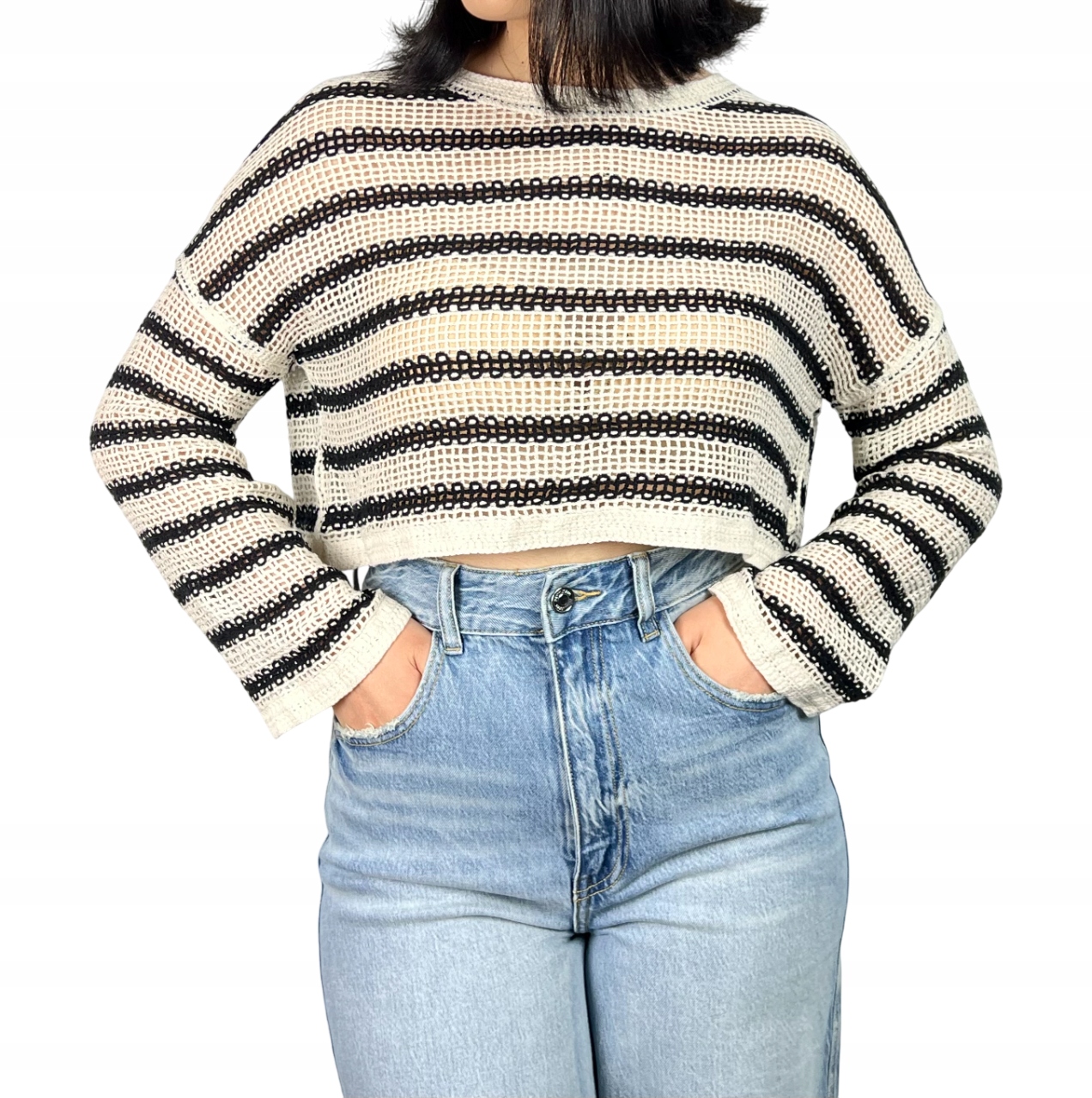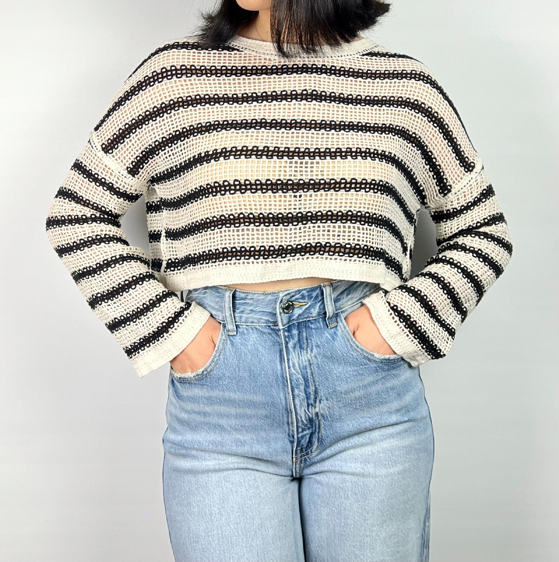 Ażurowy sweter wykonany z wysokiej jakości bawełny to idealna propozycja na letnie dni, gdy zależy nam na lekkości, przewiewności i stylowym wyglądzie. Model wyróżnia się delikatnym, ażurowym splotem, który nie tylko dodaje mu uroku, ale także zapewnia komfort noszenia nawet w cieplejsze dni. Sweter ma fason o luźnym kroju, z długim, szerokim rękawem, który swobodnie opada, nadając stylizacji lekkości i swobody. Klasyczne poziome paski podkreślają jego casualowy charakter, jednocześnie czyniąc go ponadczasowym elementem garderoby. Doskonale sprawdzi się zarówno w zestawieniu z jeansami, jak i zwiewną spódnicą, tworząc stylowy, wakacyjny look. 85% bawełna, 15% akryl.