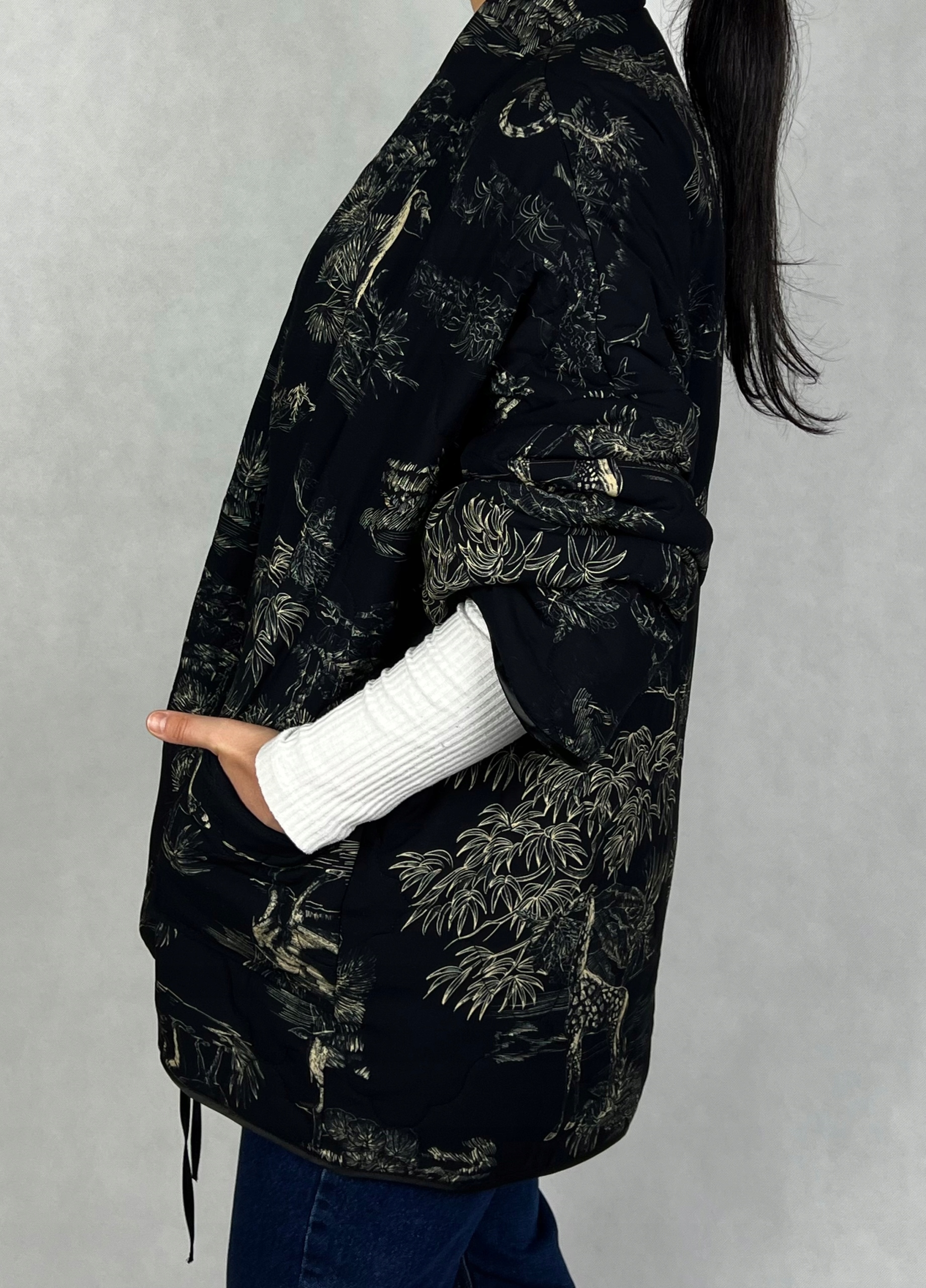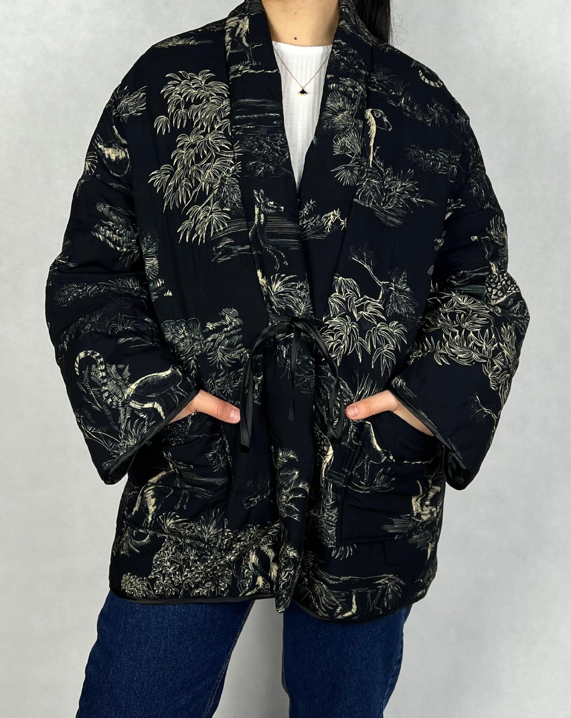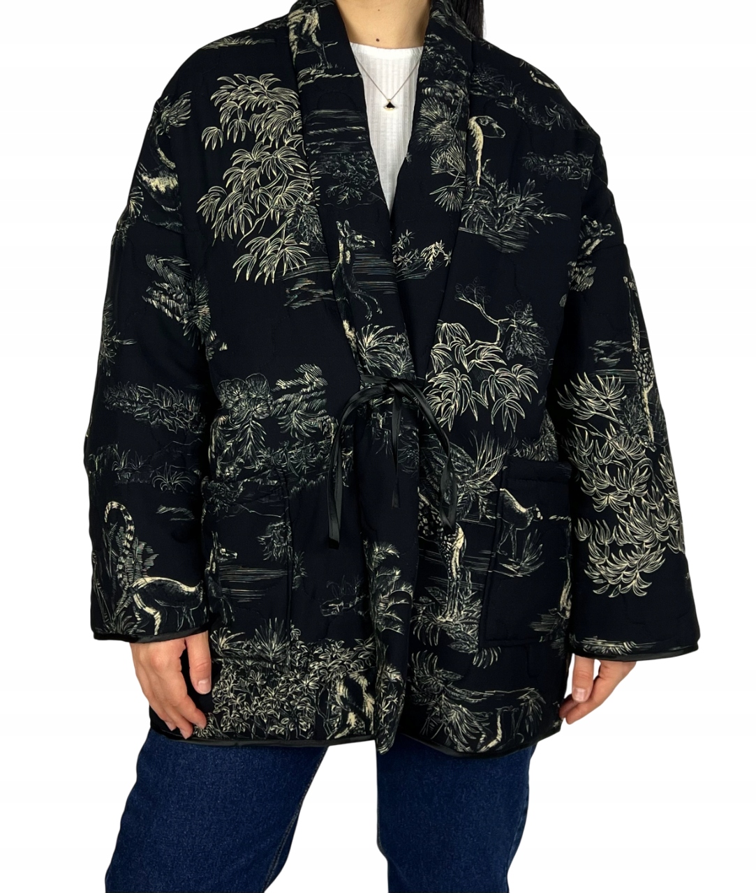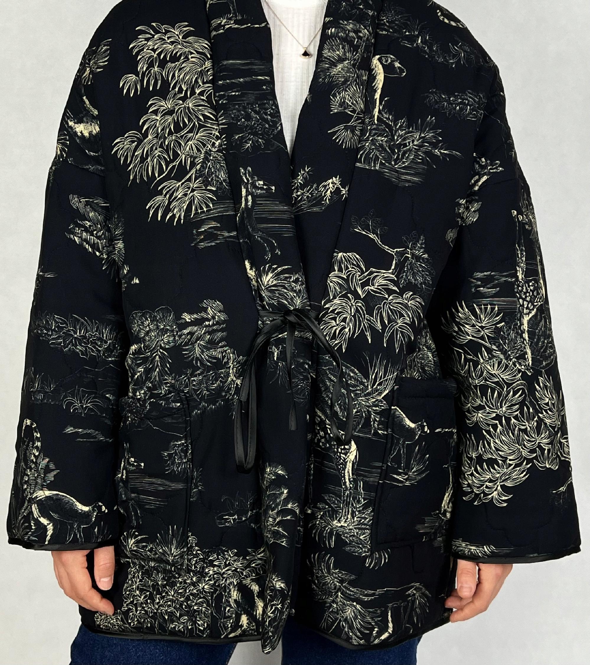 Wyjątkowa kurtka damska typu kimono to połączenie swobodnej elegancji i modnej funkcjonalności. Inspirowana klasycznym krojem japońskiego kimona, wyróżnia się wiązaniem w talii, które pozwala na idealne dopasowanie do sylwetki i podkreślenie jej atutów. Zwierzęce wzory nadają jej odważnego charakteru. Wykonanie z wiskozy sprawia, że kurtka jest przyjemna w dotyku. To idealna parka na jesień i zimę – praktyczna, a jednocześnie stylowa. Kurtka jest lekka, co sprawia, że świetnie sprawdzi się zarówno na spacerach, jak i w codziennych stylizacjach miejskich. Wierzch kurtki 100% wiskoza, podszewka 100% poliester, listwa na przodzie kurtki wypchana 100% bawełną.