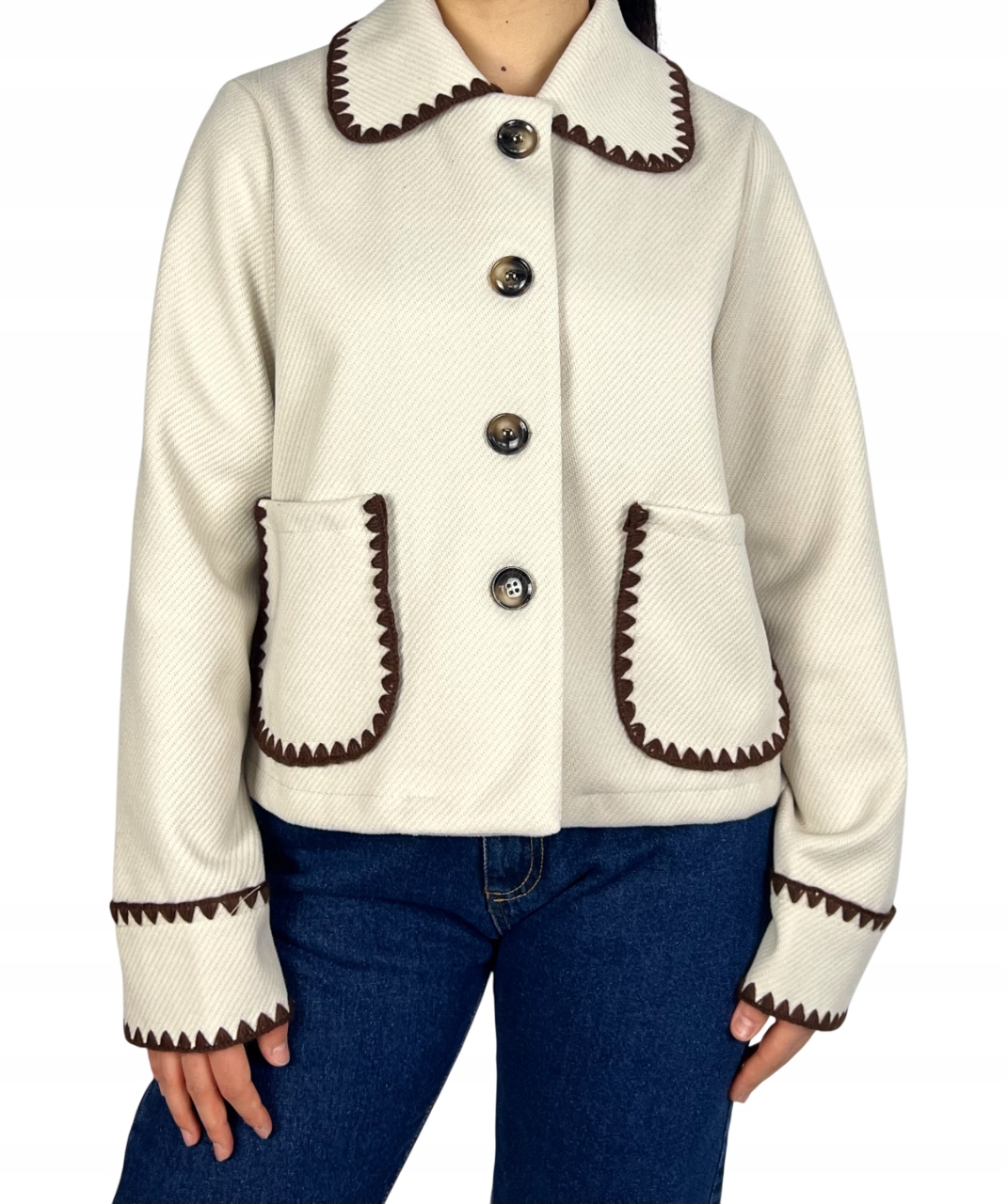 Lekka, damska kurtka wełniana to idealne połączenie klasy i wygody. Wykonana z wysokiej jakości naturalnej wełny, zapewnia delikatne ciepło i komfort noszenia, jednocześnie pozostając przewiewną. Prosty krój z eleganckim kołnierzem nadaje jej uniwersalnego charakteru, który sprawdzi się zarówno na co dzień, jak i na wyjątkowe okazje. Hafty zdobiące kurtkę dodają jej unikalnego uroku. Ta wyjątkowa kurtka to niezastąpiony element garderoby na sezon przejściowy, który podkreśli Twój indywidualny styl. 30% wełna, 70% wiskoza.