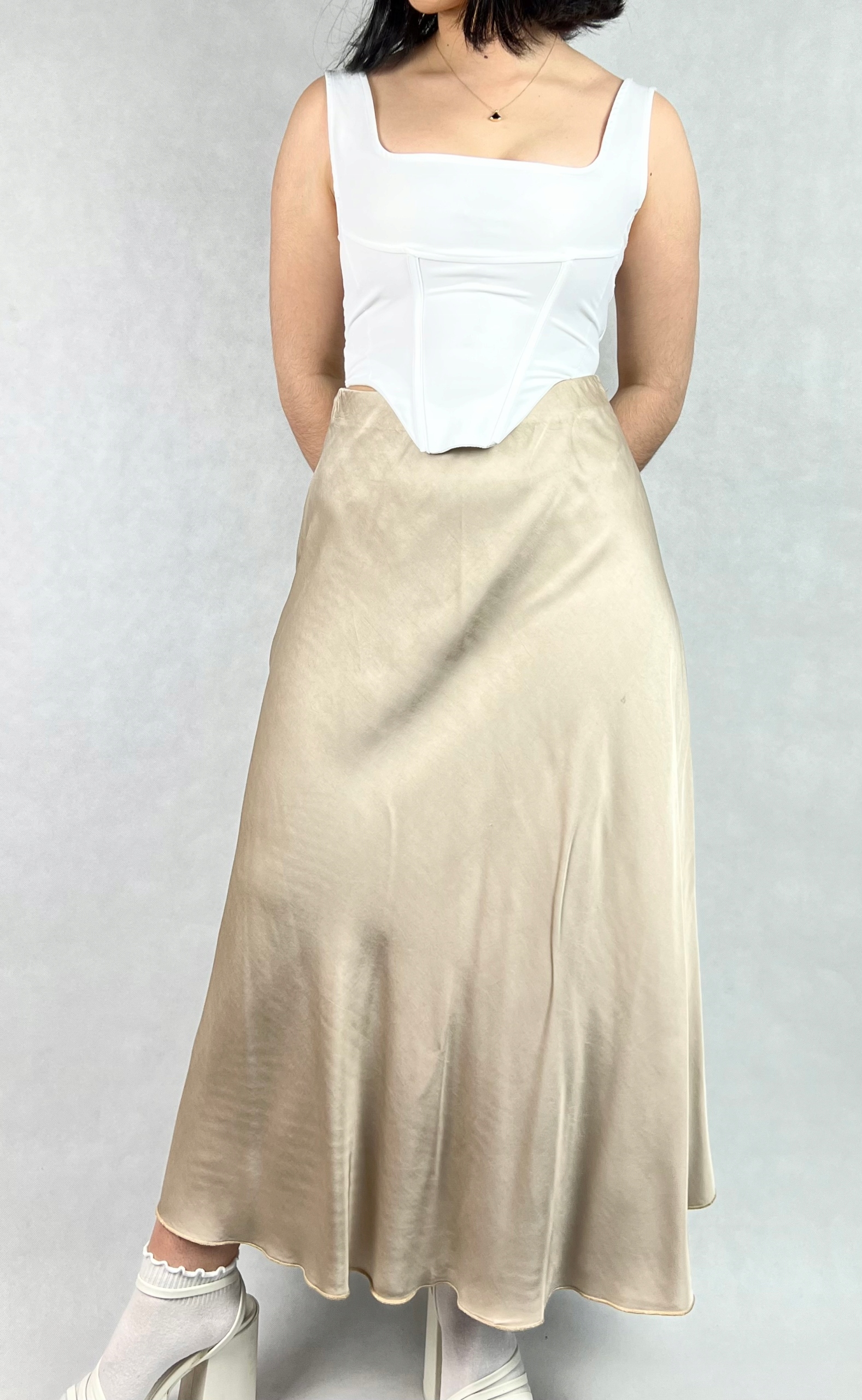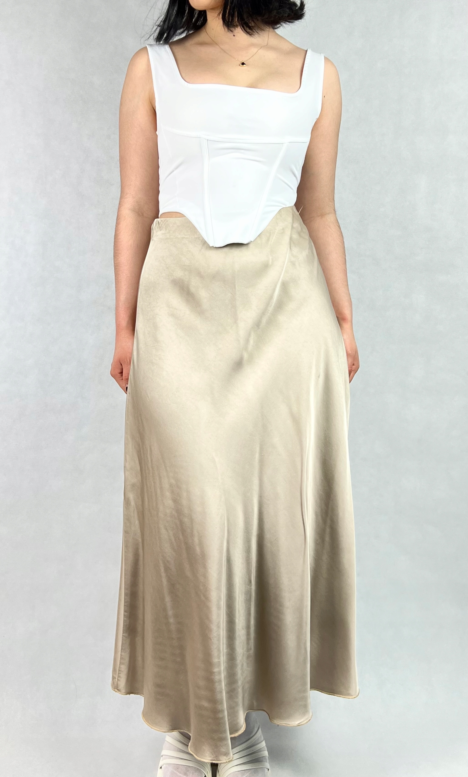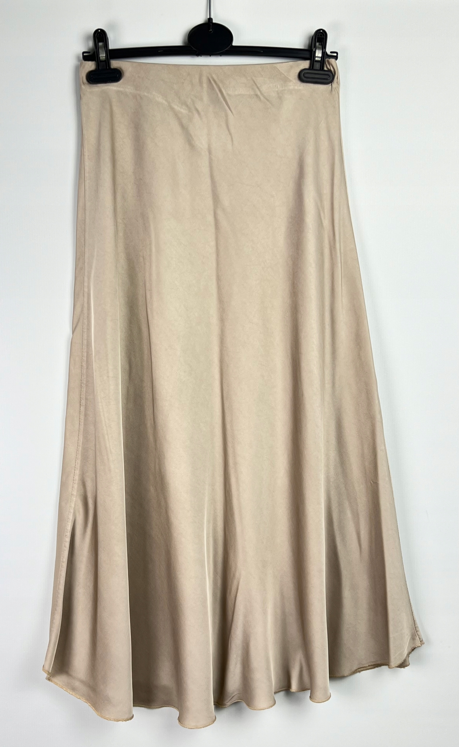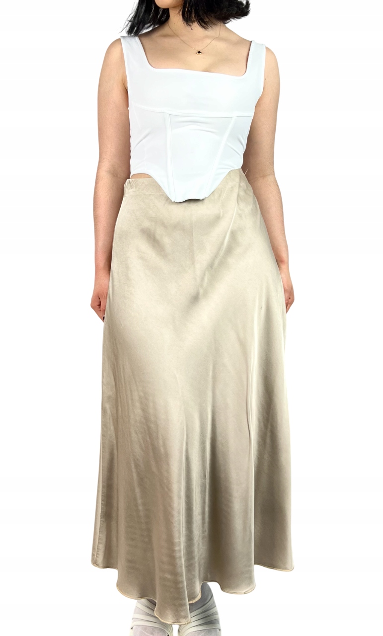 Długa jedwabna spódnica to połączenie elegancji i wyrafinowanego stylu, które sprawdzi się zarówno podczas wyjątkowych okazji, jak i w stylizacjach wieczorowych. Wykonana z wysokiej jakości materiałów, zachwyca lekkością, delikatnym połyskiem oraz jest przyjemna w dotyku. Trapezowy krój z rozkloszowanym dołem nadaje sylwetce lekkości i subtelnie ją wydłuża. W pasie znajduje się elastyczna gumka, która pozwala na wygodne dopasowanie do talii, zapewniając jednocześnie swobodę ruchów. Spódnica pięknie układa się podczas chodzenia, dodając całej stylizacji płynności i klasy. Model maxi sprawdzi się w zestawieniu z elegancką bluzką, topem czy marynarką, tworząc efektowny, kobiecy look. To idealna propozycja dla kobiet ceniących ponadczasową elegancję, wysoką jakość wykonania i komfort noszenia. 70% wiskoza, 30% jedwab.