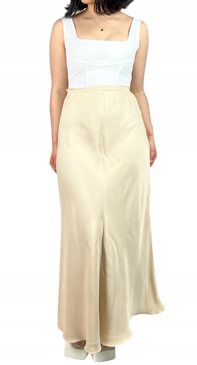 Długa jedwabna spódnica to połączenie elegancji i wyrafinowanego stylu, które sprawdzi się zarówno podczas wyjątkowych okazji, jak i w stylizacjach wieczorowych. Wykonana z wysokiej jakości materiałów, zachwyca lekkością, delikatnym połyskiem oraz jest przyjemna w dotyku. Trapezowy krój z rozkloszowanym dołem nadaje sylwetce lekkości i subtelnie ją wydłuża. W pasie znajduje się subtelna, elastyczna gumka, dyskretnie ukryta pod dekoracyjnym wzorem, który podkreśla elegancki charakter spódnicy i dodaje jej wyjątkowego uroku. Spódnica pięknie układa się podczas chodzenia, dodając całej stylizacji płynności oraz klasy. Model maxi sprawdzi się w zestawieniu z elegancką bluzką, topem czy marynarką, tworząc efektowny, kobiecy look. To idealna propozycja dla kobiet ceniących ponadczasową elegancję, wysoką jakość wykonania i komfort noszenia. 70% wiskoza, 30% jedwab.
