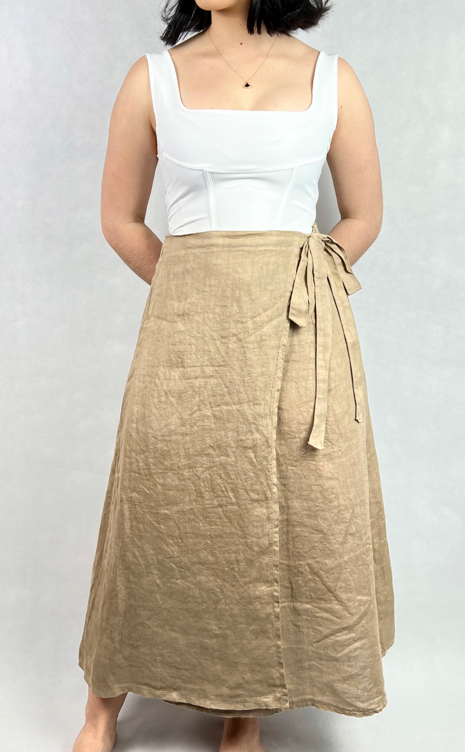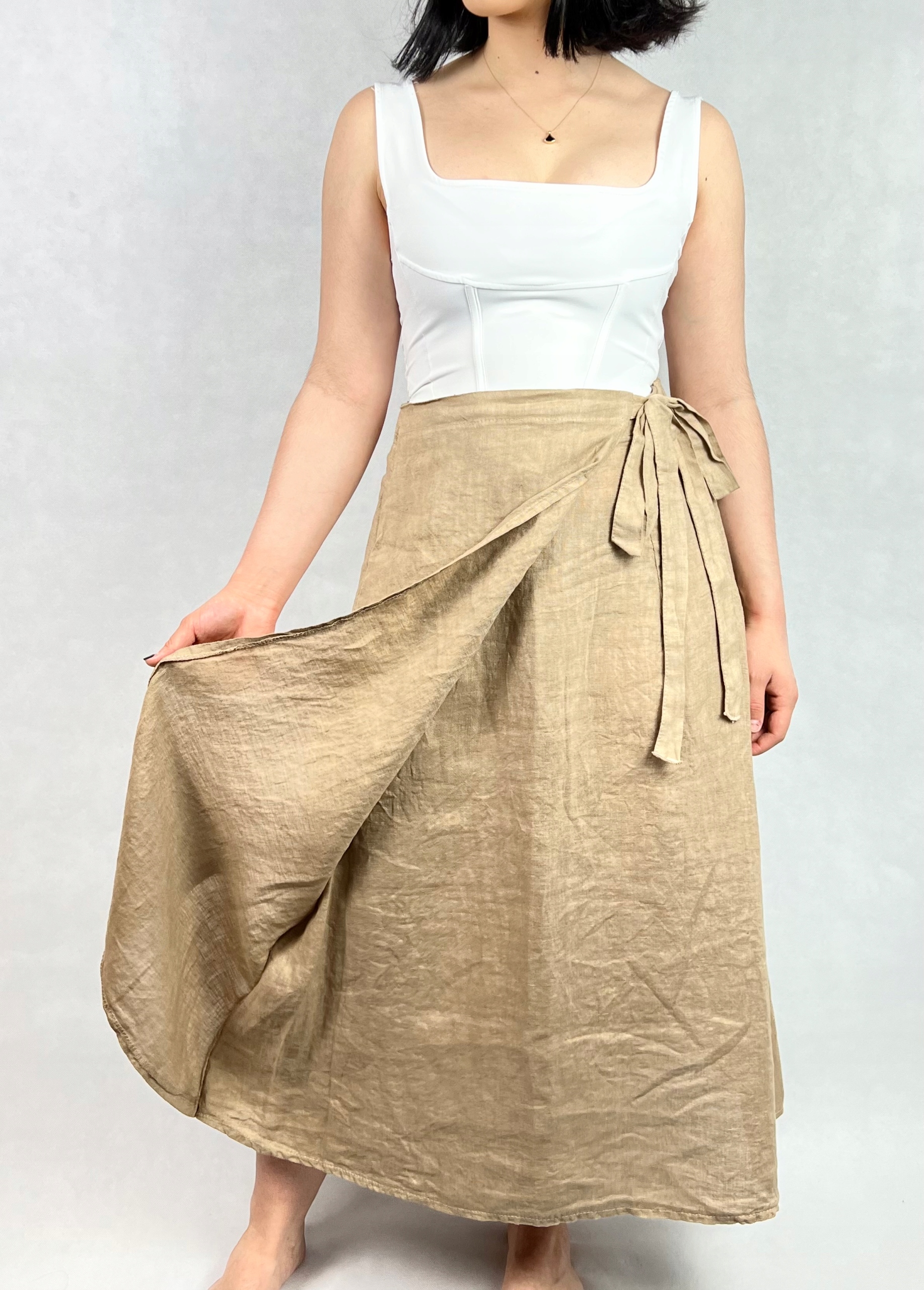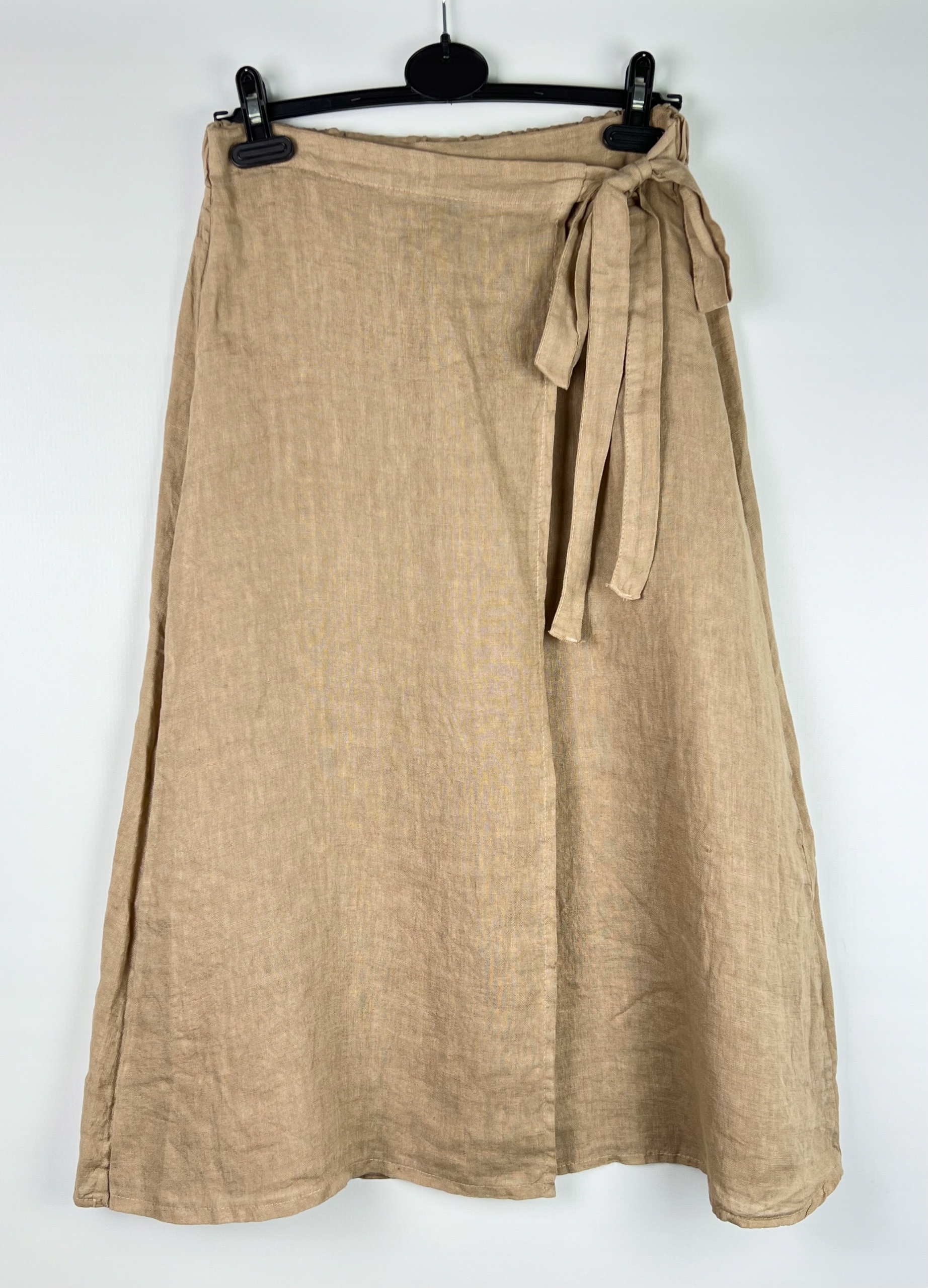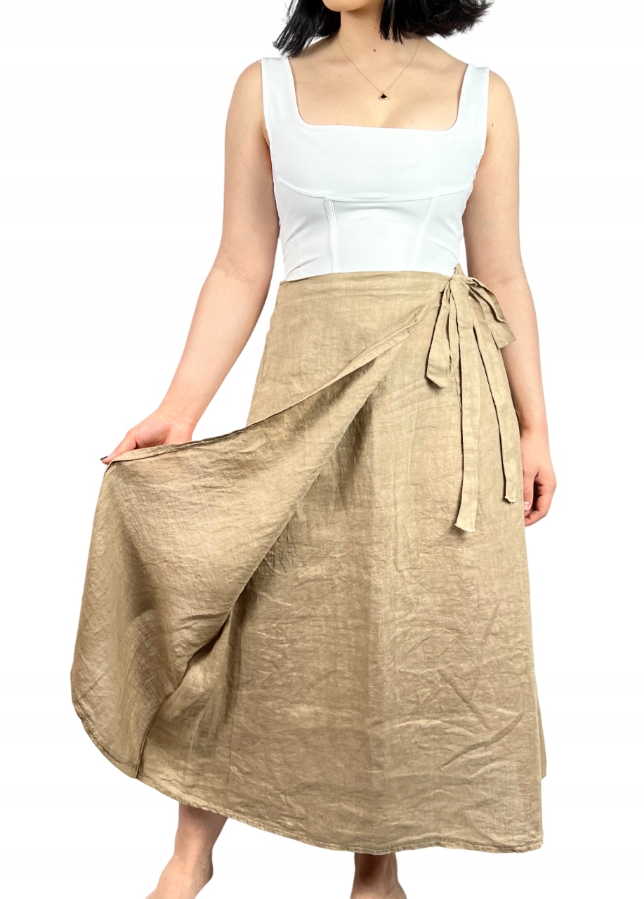 Długa spódnica trapezowa, wykonana z wysokiej jakości lnu, zapewnia przewiewność, lekkość i wygodę przez cały dzień. Materiał jest miękki w dotyku, trwały i doskonale sprawdza się w cieplejsze dni. Spódnica posiada gumkę w pasie, która gwarantuje dopasowanie do sylwetki, oraz dodatkowe wiązanie z boku, dzięki któremu można podkreślić talię i nadać stylizacji indywidualnego charakteru. Rozcięcie z boku dodaje lekkości i sprawia, że fason nabiera nowoczesnego wyglądu. To uniwersalna propozycja, którą z łatwością zestawisz z koszulą, topem lub lekkim swetrem, tworząc stylizację idealną na spacer, do pracy lub letnie spotkanie. Minimalistyczna forma i szlachetna faktura lnu sprawiają, że spódnica będzie świetną bazą dla wielu zestawów — zarówno tych codziennych, jak i bardziej eleganckich. 100% len.