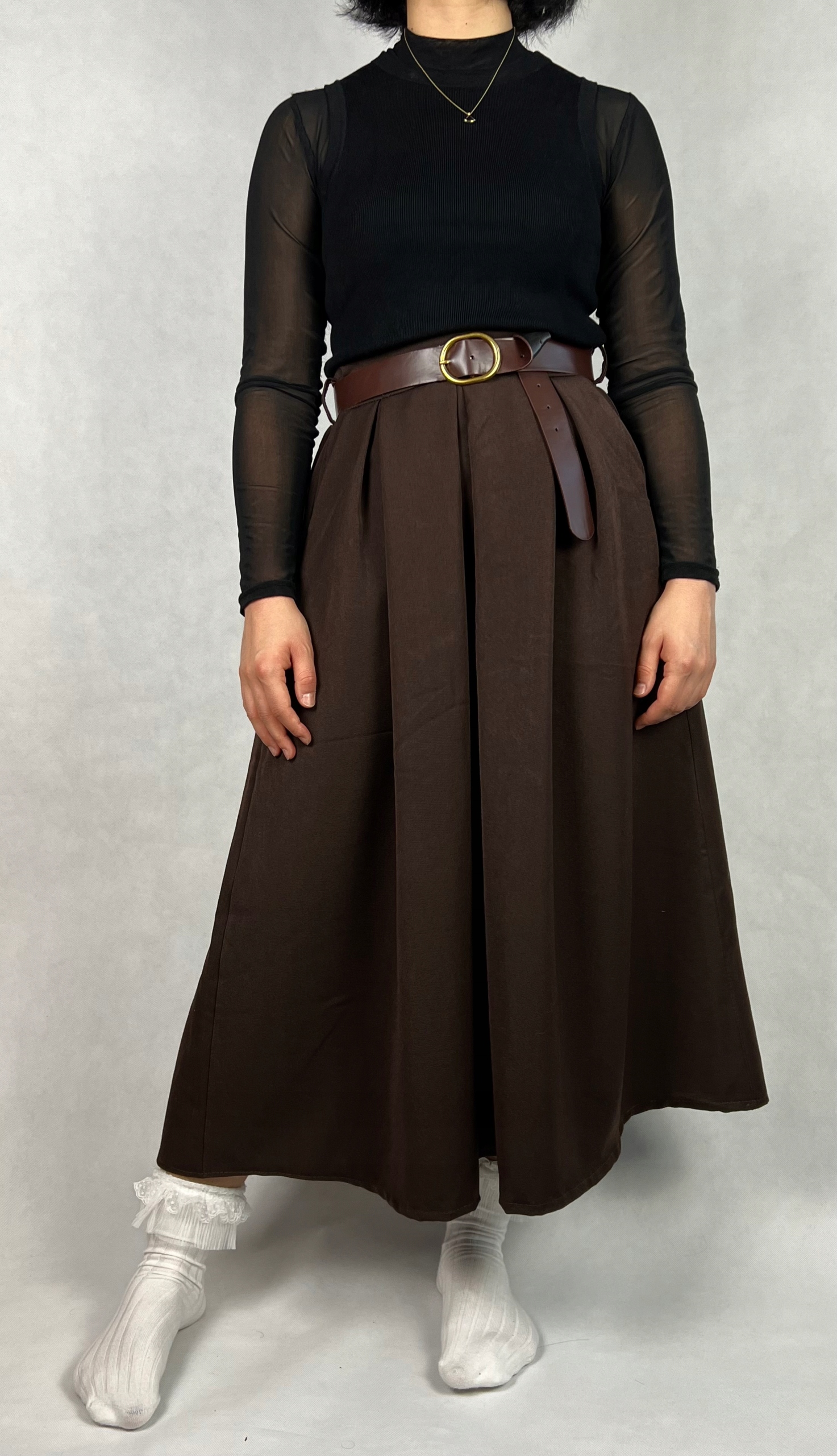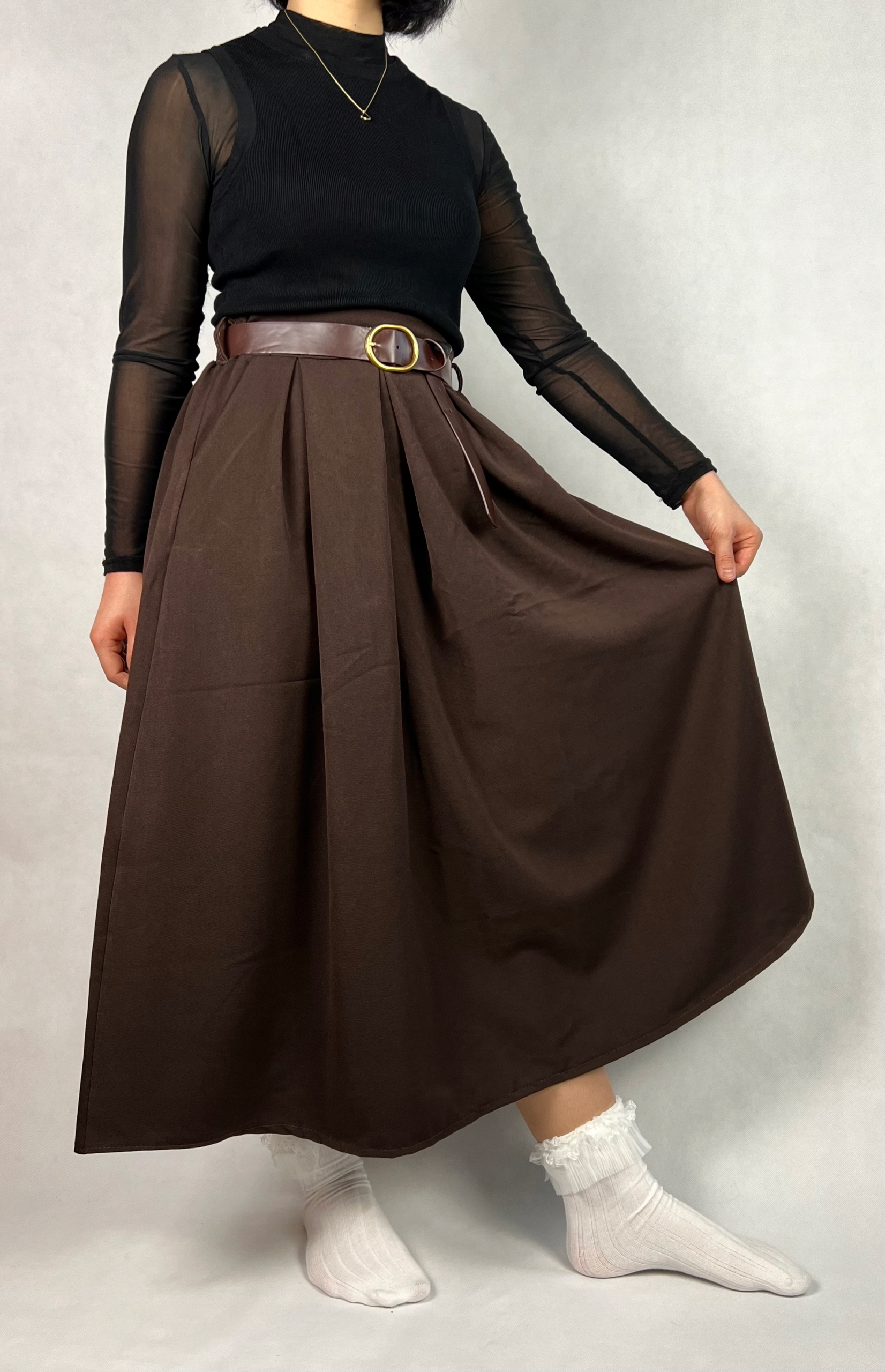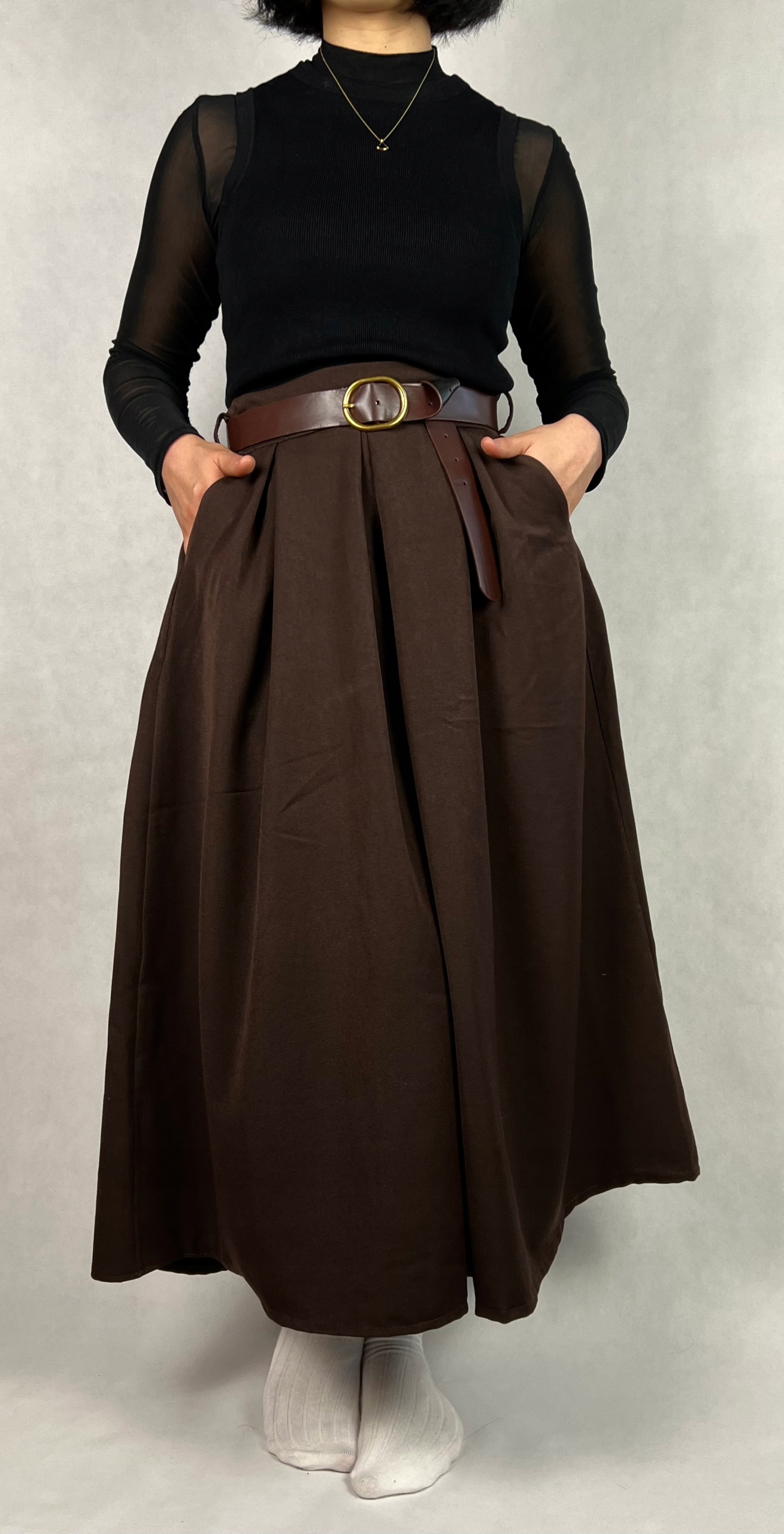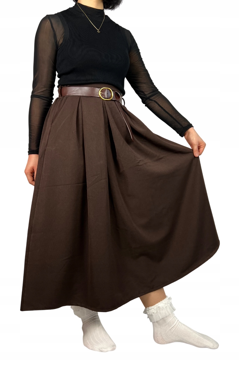 Spódnica damska midi o trapezowym kroju to kwintesencja vintage’owego stylu i codziennej wygody. Rozkloszowany fason nadaje sylwetce lekkości i elegancji, a praktyczne kieszenie dodają funkcjonalności. Gumka w talii zapewnia idealne dopasowanie i komfort noszenia, niezależnie od okazji. Dodatkiem do spódnicy jest pasek, który można stylowo zawiązać, podkreślając talię i dodając całości wyjątkowego charakteru. Doskonale sprawdzi się zarówno w casualowych, jak i bardziej eleganckich stylizacjach. To niezastąpiony element garderoby dla kobiet ceniących klasykę w nowoczesnym wydaniu. 74% poliester, 22% wiskoza, 4% elastan.