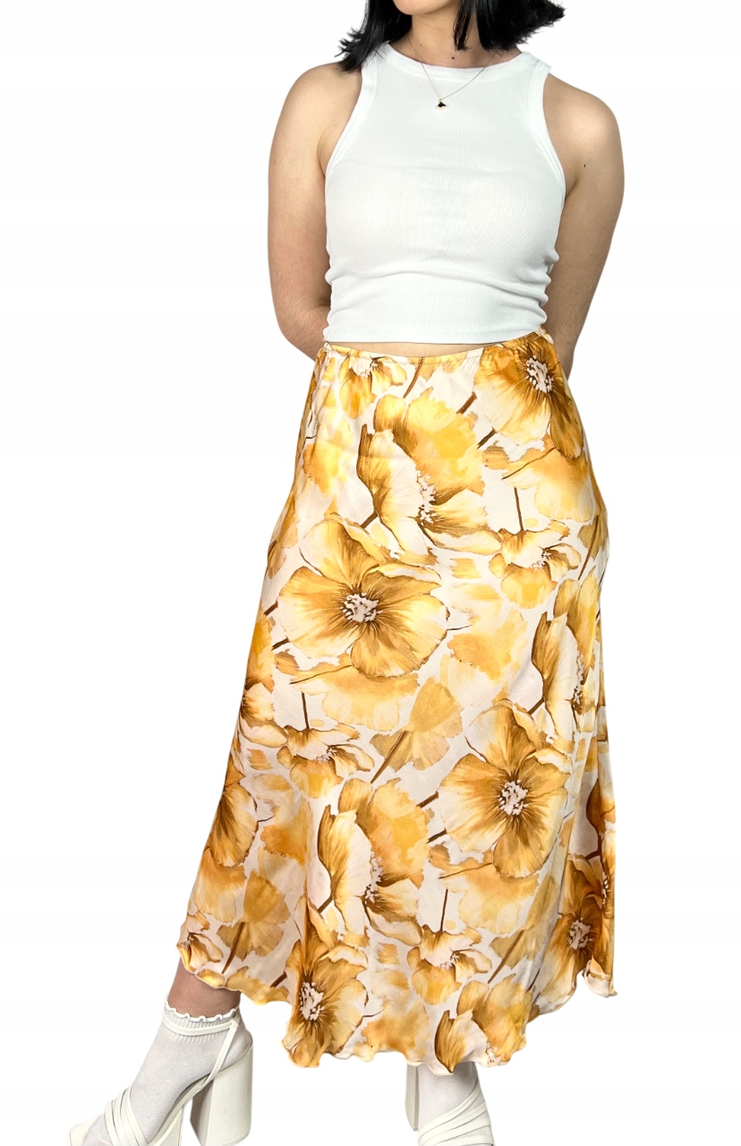 Długa spódnica w kwiaty to połączenie elegancji i wyrafinowanego stylu, które sprawdzi się zarówno podczas wyjątkowych okazji, jak i w stylizacjach wieczorowych. Zachwyca lekkością, delikatnym połyskiem oraz jest przyjemna w dotyku. Trapezowy krój z rozkloszowanym dołem nadaje sylwetce lekkości i subtelnie ją wydłuża. W pasie znajduje się subtelna, elastyczna gumka, która podkreśla elegancki charakter spódnicy i dodaje jej wyjątkowego uroku. Spódnica pięknie układa się podczas chodzenia, dodając całej stylizacji płynności oraz klasy. Model maxi sprawdzi się w zestawieniu z elegancką bluzką, topem czy marynarką, tworząc efektowny, kobiecy look. To idealna propozycja dla kobiet ceniących ponadczasową elegancję, wysoką jakość wykonania i komfort noszenia. 100% wiskoza.