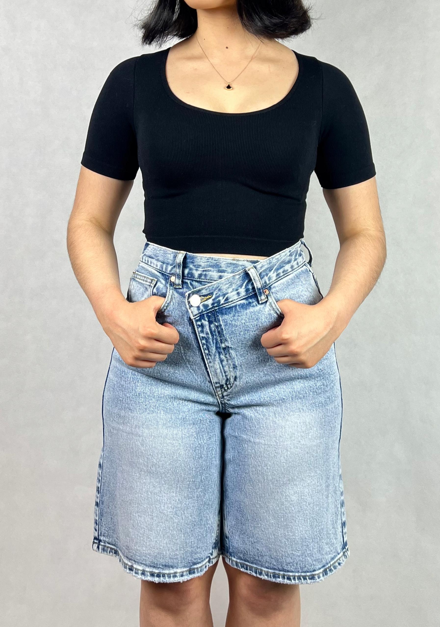 Spodnie jeansowe o prostym kroju z wysokim stanem i szeroką nogawką to postawienie na wygodę i styl. Wykonane z wysokiej jakości bawełny, doskonale dopasowują się do sylwetki, podkreślając jej atuty i zapewniając komfort codziennego noszenia. Krótszy fason sięgający przed kolano sprawia, że idealnie sprawdzą się w cieplejsze dni. Spodnie posiadają kieszenie zarówno z przodu, jak i z tyłu, co zwiększa ich funkcjonalność. Charakterystyczne przetarcia nadają im modnego, casualowego wyglądu, który świetnie wpisuje się w luźne, miejskie stylizacje. 98% bawełna.