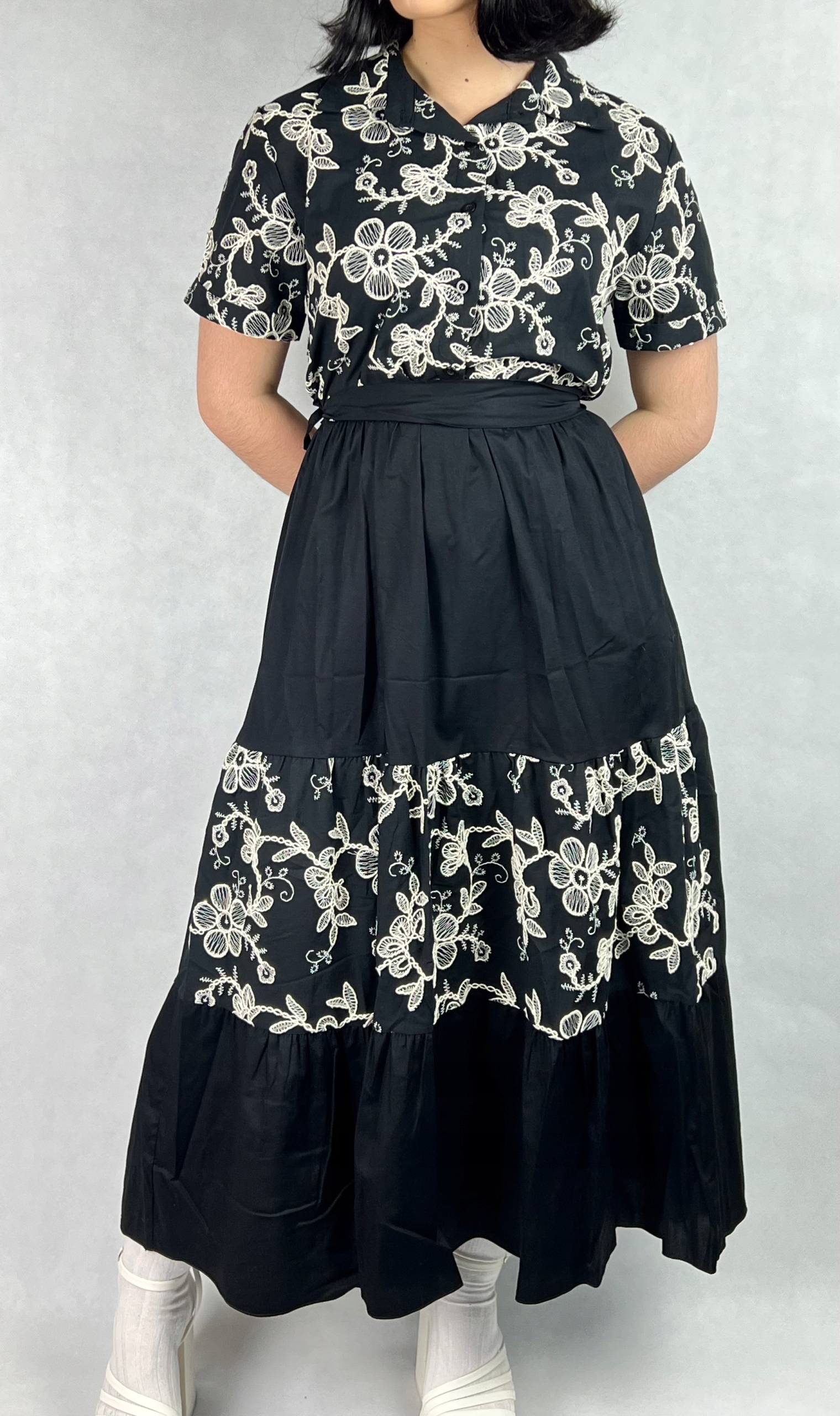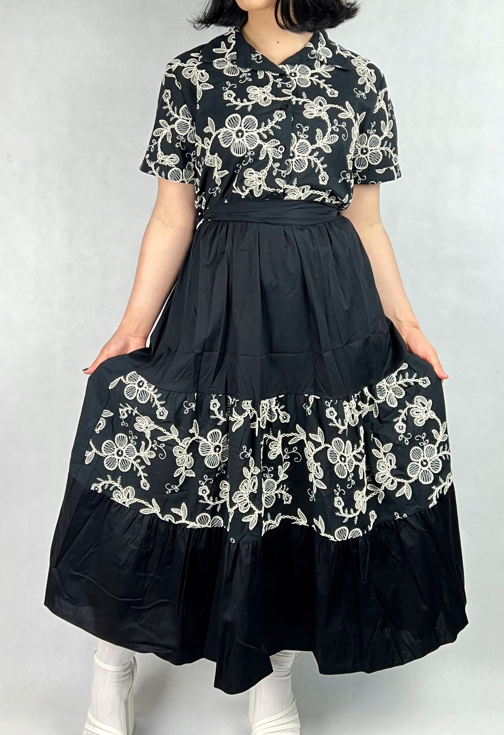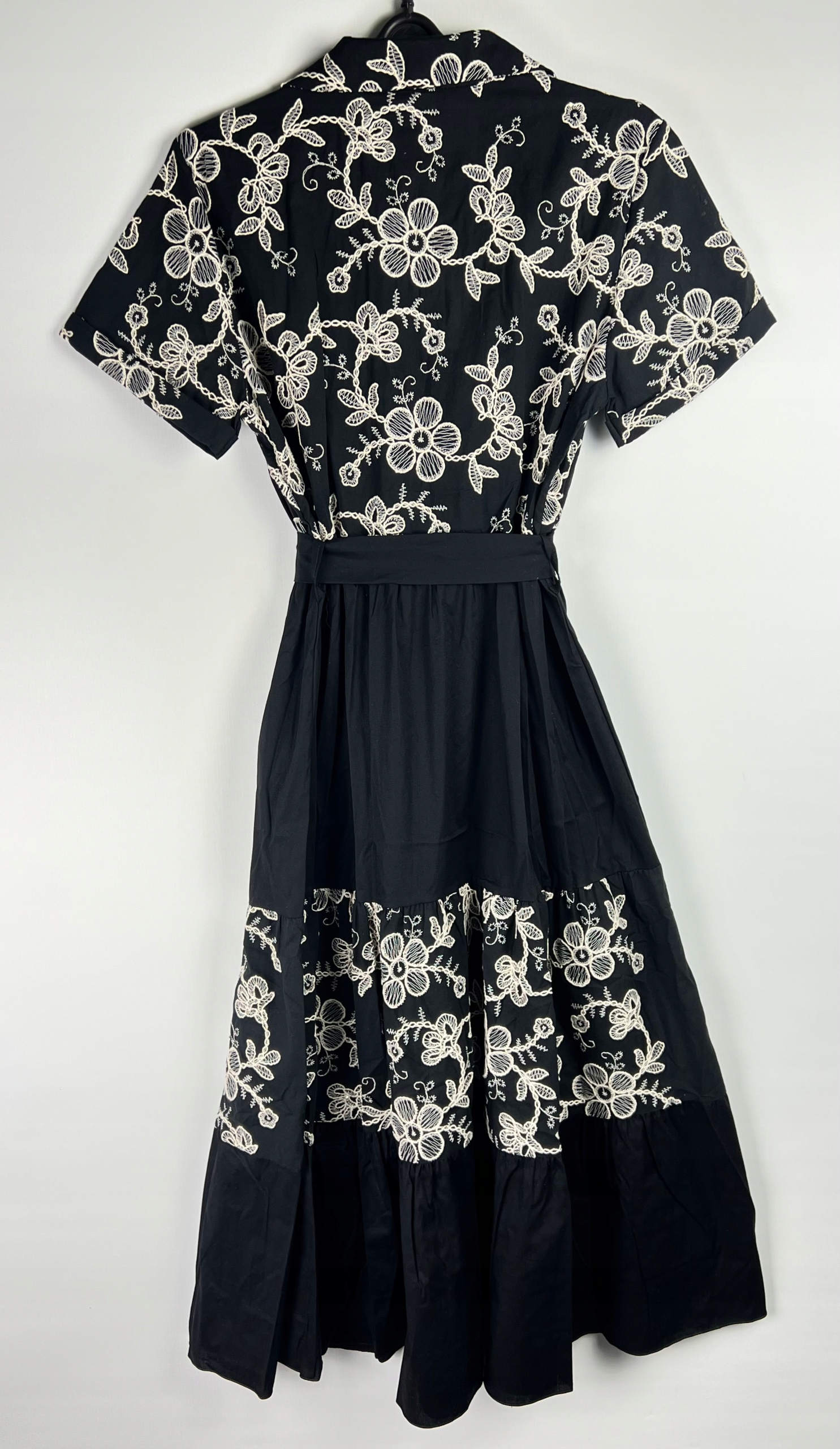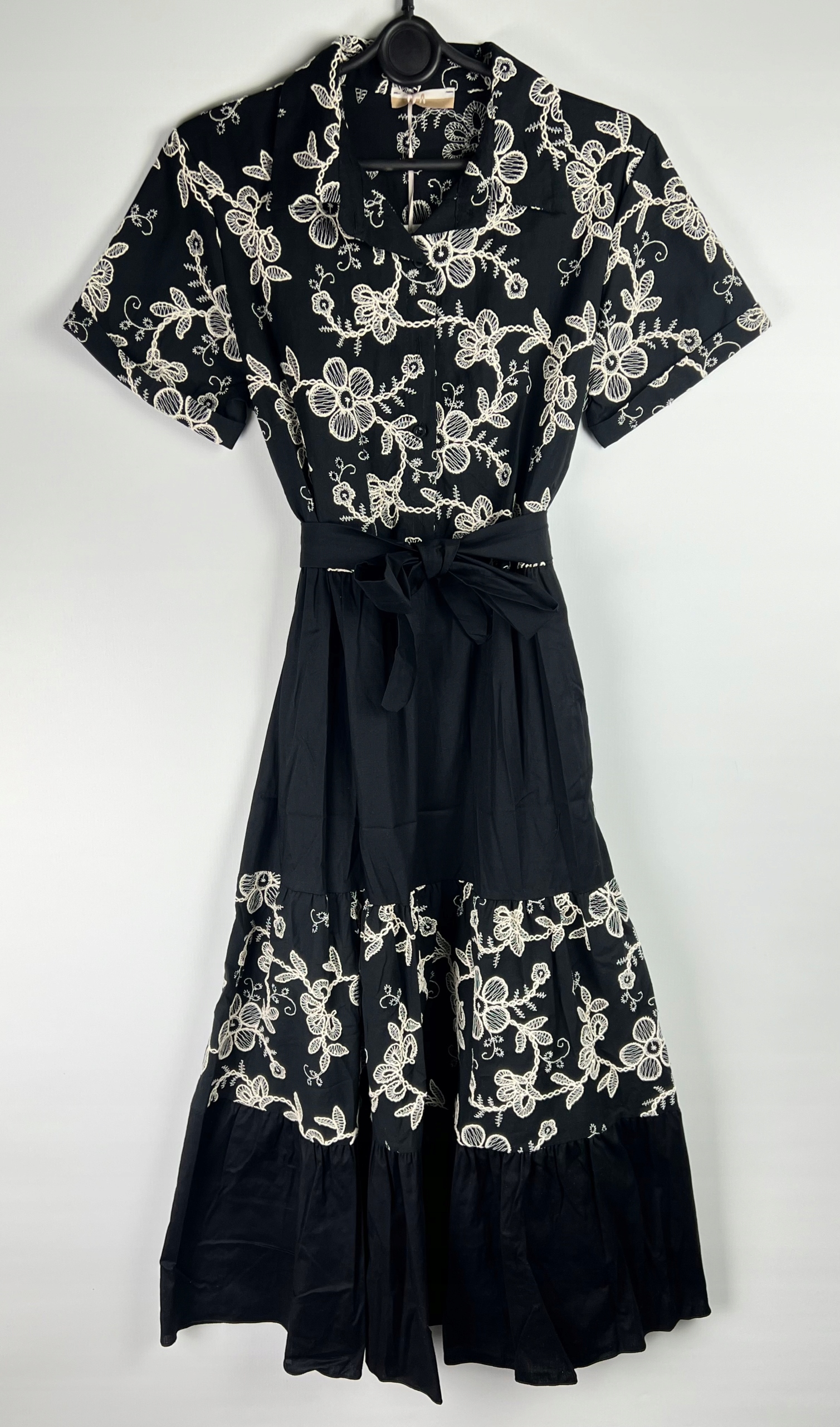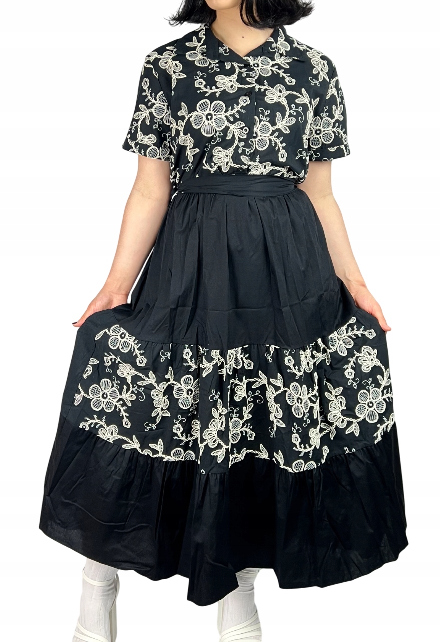 Długa sukienka z haftami to elegancka propozycja dla kobiet poszukujących klasyki w nowoczesnym wydaniu. Rozkloszowany fason nadaje sylwetce lekkości i wdzięku, podkreślając talię i swobodnie układając się podczas ruchu. Sukienka zapinana jest z przodu na guziki, a dodatkowe wiązanie pozwala zawiązać kokardkę, co nie tylko zwiększa komfort noszenia, ale też subtelnie akcentuje talię i dodaje kobiecego uroku. Haftowane detale, wraz z przymocowanymi cekinami dodają sukience artystycznego charakteru, czyniąc ją idealnym wyborem na wyjątkowe okazje. Cechy te sprawiają, że doskonale sprawdzi się jako kreacja wieczorowa, ale może być także noszona w bardziej casualowej wersji – z odpowiednimi dodatkami. Wykonana jest z wysokiej jakości bawełny gwarantując przewiewność i przyjemne uczucie na skórze, nawet podczas dłuższego noszenia. To sukienka, która łączy elegancję, jakość i ponadczasowy styl, stanowiąc doskonałą bazę do wielu stylizacji. 100% bawełna.