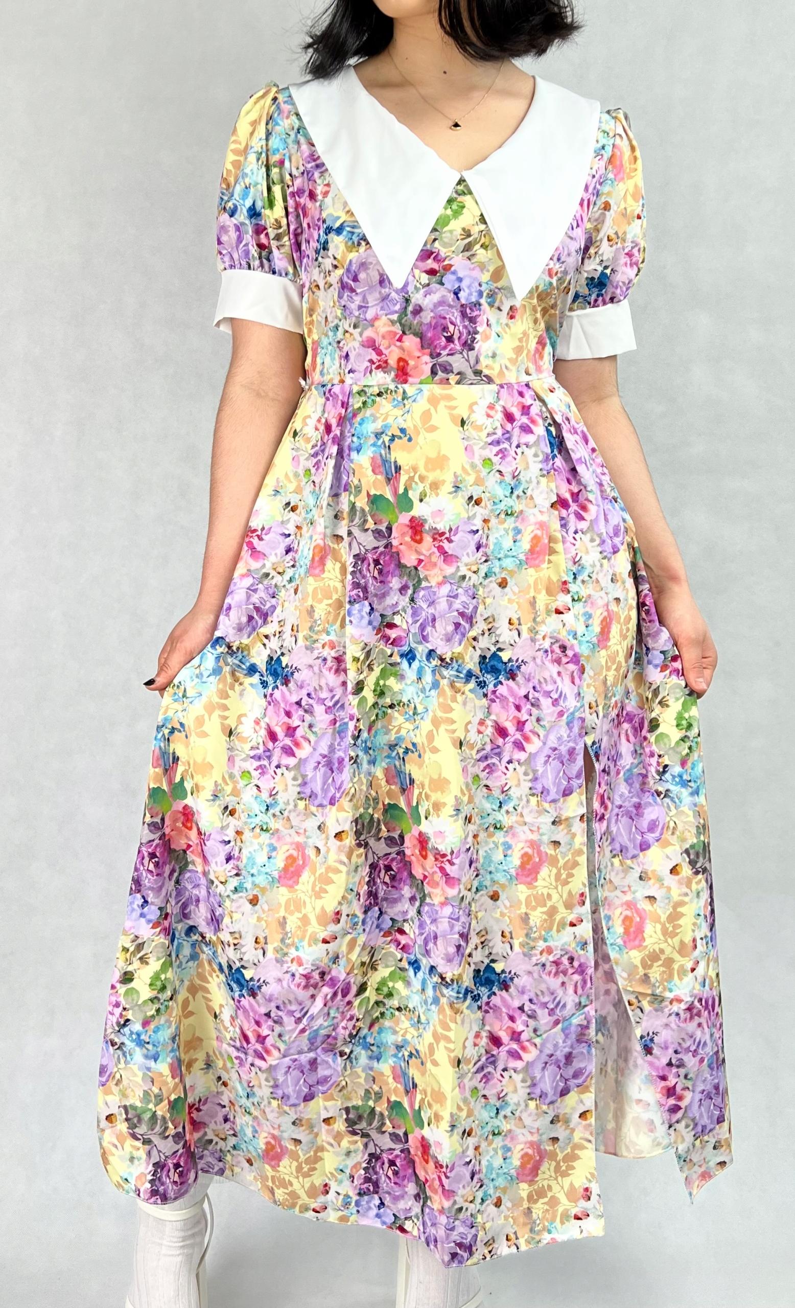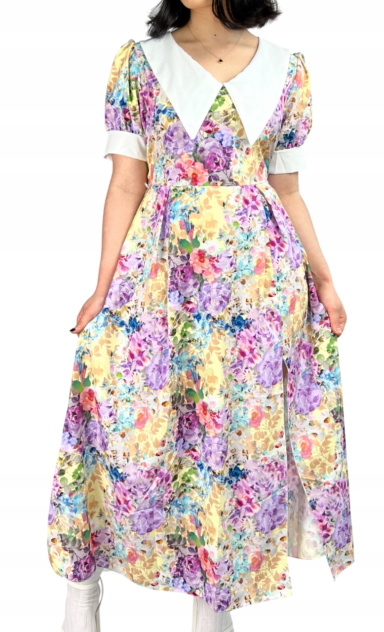 Sukienka koktajlowa w kwiaty, maxi z rozcięciem, pin-up
