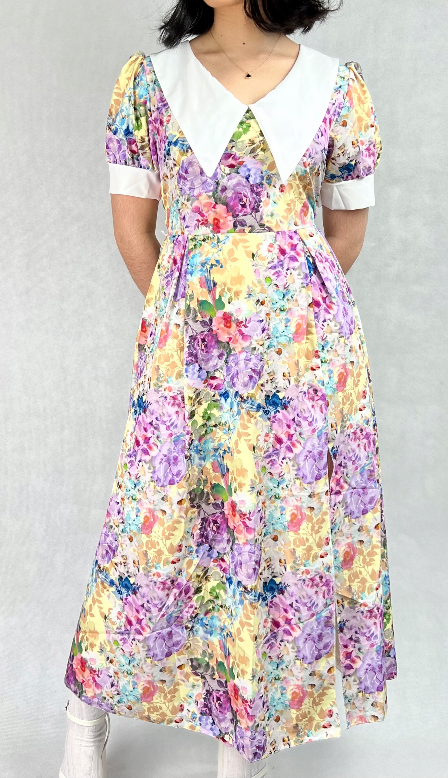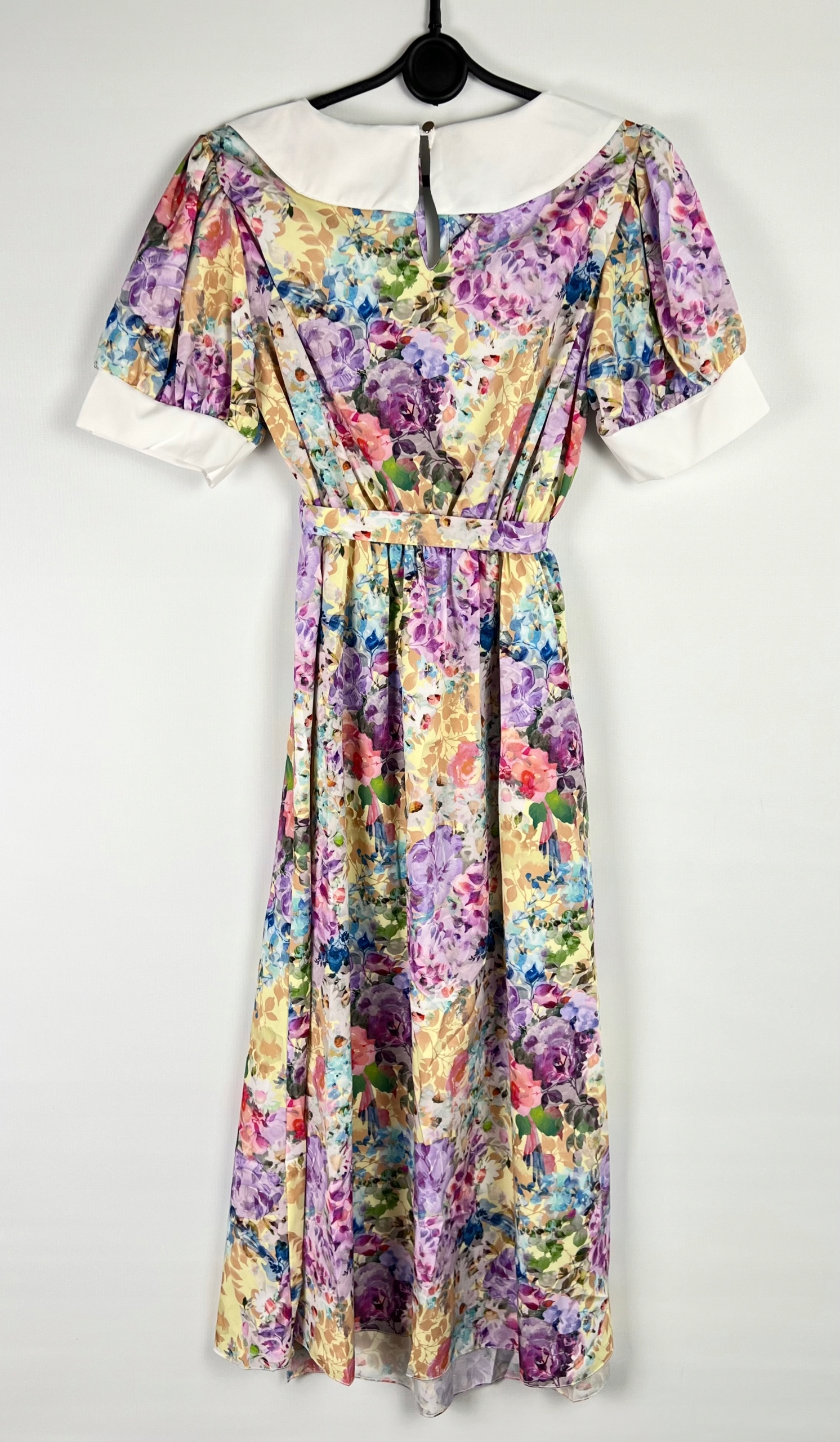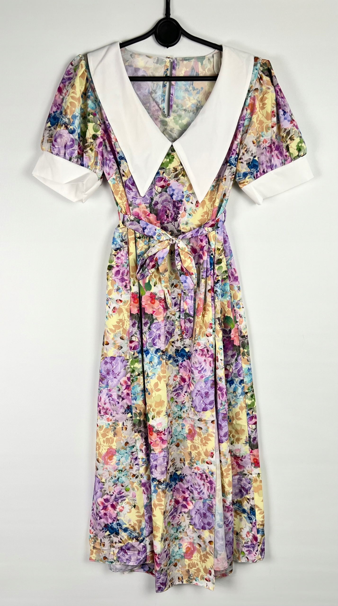 Sukienka pin-up, koktajlowa z krótkim rękawem i kołnierzem to propozycja dla kobiet, które cenią klasyczne fasony inspirowane modą retro. Rozkloszowany krój i rozcięcie pięknie podkreślają figurę oraz talię, nadając sylwetce lekkości i elegancji. Sukienka zapinana jest z tyłu na guzik, a dodatkowe wiązanie pozwala zawiązać kokardkę, co nie tylko zwiększa komfort noszenia, ale też subtelnie akcentuje talię i dodaje kobiecego uroku. Model wyposażono w gumkę wszytą w pasie sprawiając, że sukienka lepiej dopasowuje się do sylwetki. To idealny wybór na specjalne okazje – wesela, przyjęcia, randki czy sesje zdjęciowe, ale również jako element codziennego stroju dla miłośniczek stylu vintage. Materiał, z którego została wykonana, jest przyjemny w dotyku i lekki, doskonale sprawdzający się na lato. Ten ponadczasowy model świetnie komponuje się z butami na obcasie, balerinami czy klasycznymi dodatkami w stylu lat 50., tworząc pełną wdzięku i klasy stylizację. 96% poliester, 4% elastan.