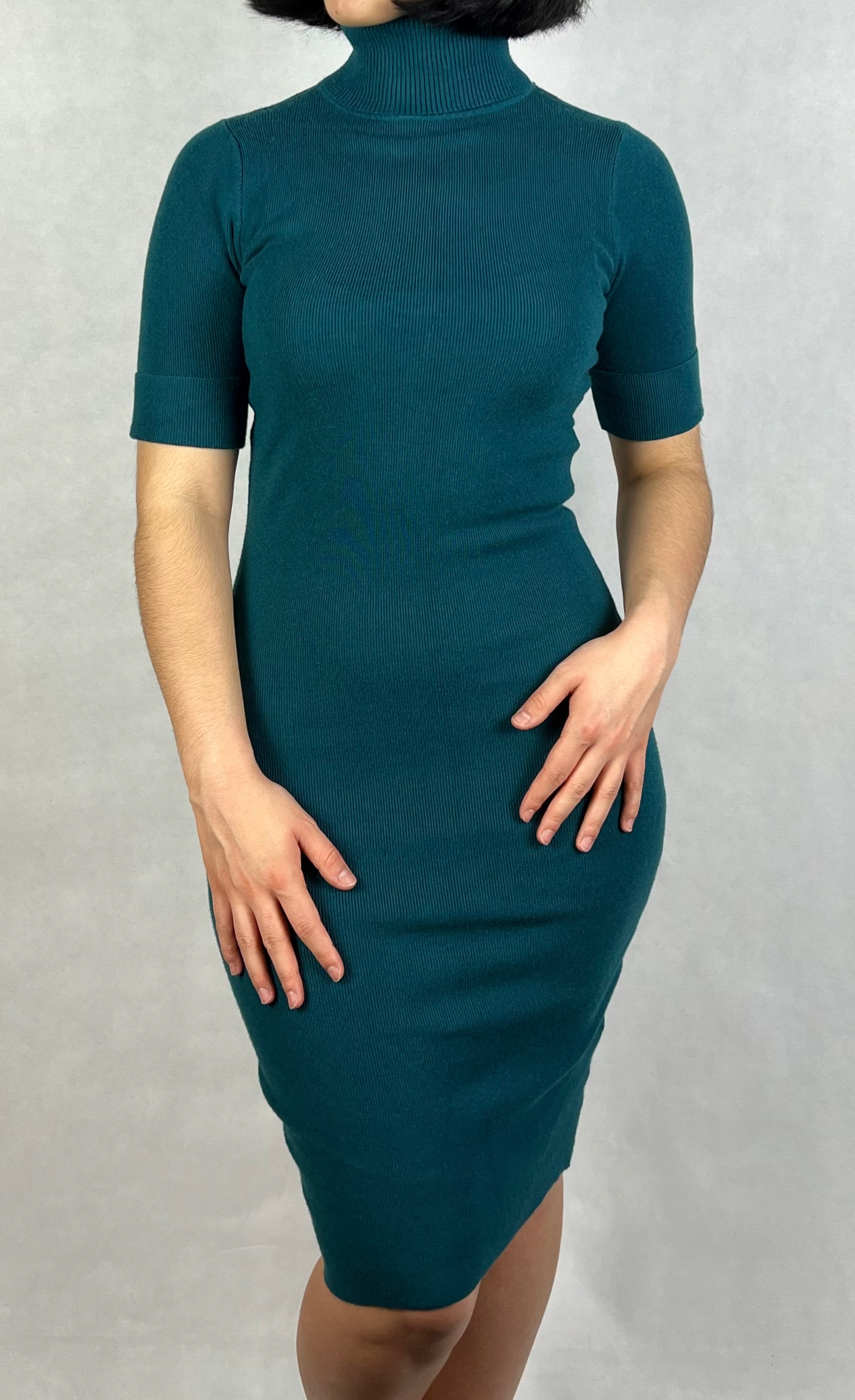 Elegancka sukienka swetrowa z golfem to idealne połączenie stylu i wygody. Dopasowany krój podkreśla sylwetkę, a elastyczny materiał zapewnia doskonałe dopasowanie do różnych rozmiarów. Sukienka wykonana jest z miękkiej, rozciągliwej dzianiny, która otula ciało, zapewniając komfort noszenia przez cały dzień. Golf dodaje jej szyku, sprawiając, że świetnie sprawdzi się zarówno jako strój na co dzień, jak i na wieczorne wyjście. Uniwersalny design pozwala łatwo zestawiać ją z dodatkami, tworząc stylizacje na różne okazje. 88% wiskoza, 12% nylon.